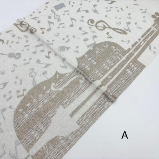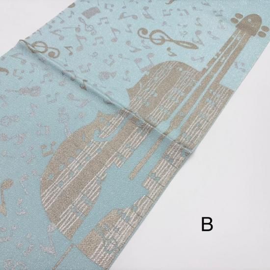 金銀通しのキラキラした生地にシャンパンゴールドとシルバーのチェロや音符が華やかな帯揚げです。