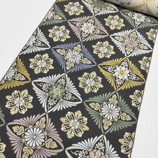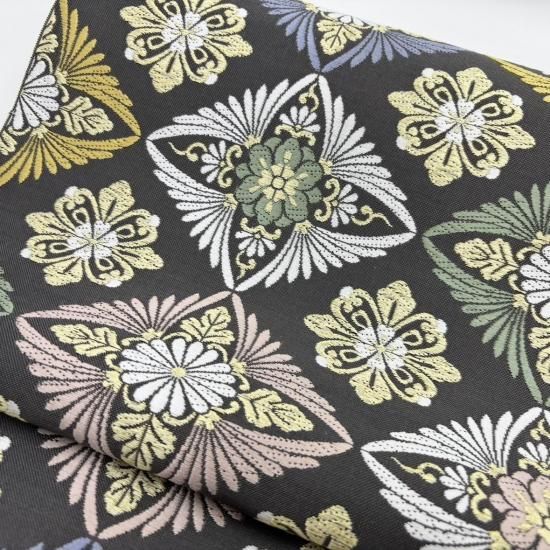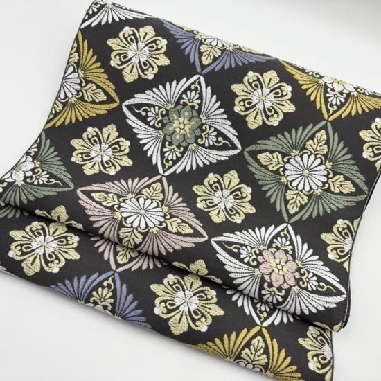 墨黒地にくすみカラーの花菱が品の良い帯。