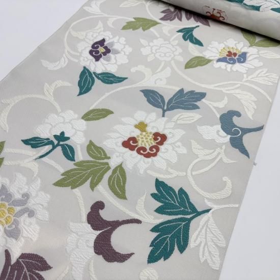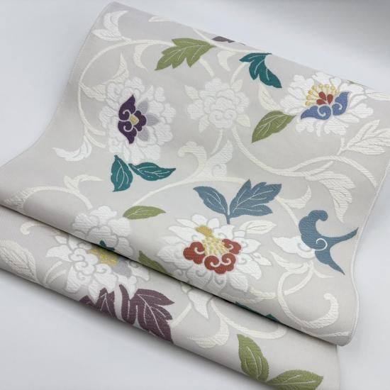 グレー地に唐花が躍動感のある帯。